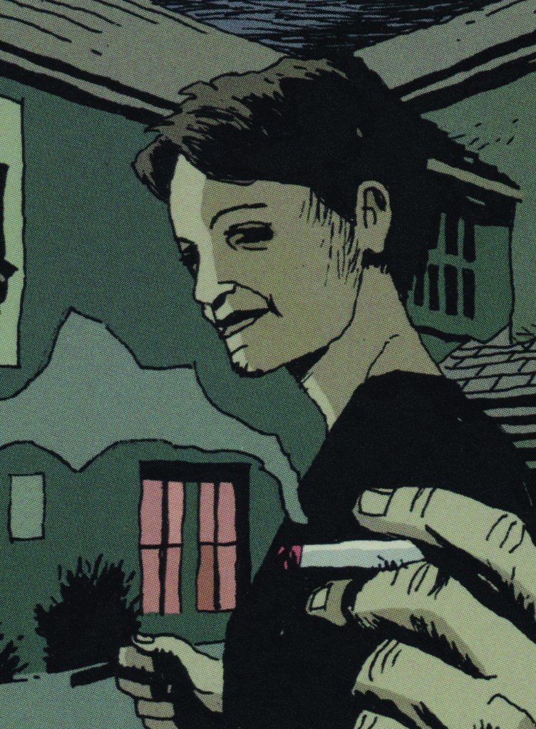While I’m getting my head around just who everyone is and who fits where with what, I love the writing in this, alluding to the current climate of hysterical insanity and underhand conspiracy spook hauntology we find ourselves in, while referencing historical narrative leylines if you like, but having its own poetic tone and vocabulary that seemingly stream of consciousness crosscuts and cuts-up- the parallel visual narrative. As with all genuinely great work, what you have is a fully realised vision of a world which , as a viewer and reader you want to fully inhabit, are pulled into and want to know. Both the writing and art are creating a tension, threat and mystery, causing us to wonder at where these seemingly disparate characters are headed, and how they are linked if at all, and by what. On occasion it felt to me like it had an echo of the opening of the brilliant Dennis Potter’s The Singing Detective – you’re aware of a sense of uncertainty and unease, an undercurrent of darkness you feel drawn into.